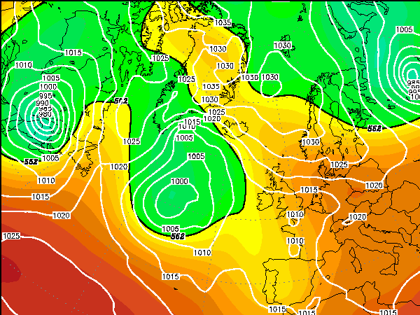 Auf ihr sind die Isobaren (SLP in hPa) zu sehen (die Einfärbung gibt ebenfalls die Druckhöhe an). Die blaue Linie (540er Linie) ist eine Isohypse, die kennzeichnet, wo die 500hPa-1000hPa-Schicht 540dam dick ist. Siehe dazu unten die Erläuterungen zur IGES-Karte Bodendruck, Schichtdicke.|