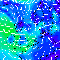 Die Windpfeile geben wie üblich Windrichtung und -geschwindigkeit (in Knoten) an. Zusätzlich sind die Gebiete unterschiedlicher Windgeschwindigkeit verschieden eingefärbt, was ein beinahe plastisches Bild des 'Windgeschehens' ergibt. Auf dem Beispiel links ist durch die Einfärbung z.B. sofort zu erkennen, daß es auf dem Wasser heftiger weht (grün) als an Land (blau); besonders augenfällig im Ärmelkanal.